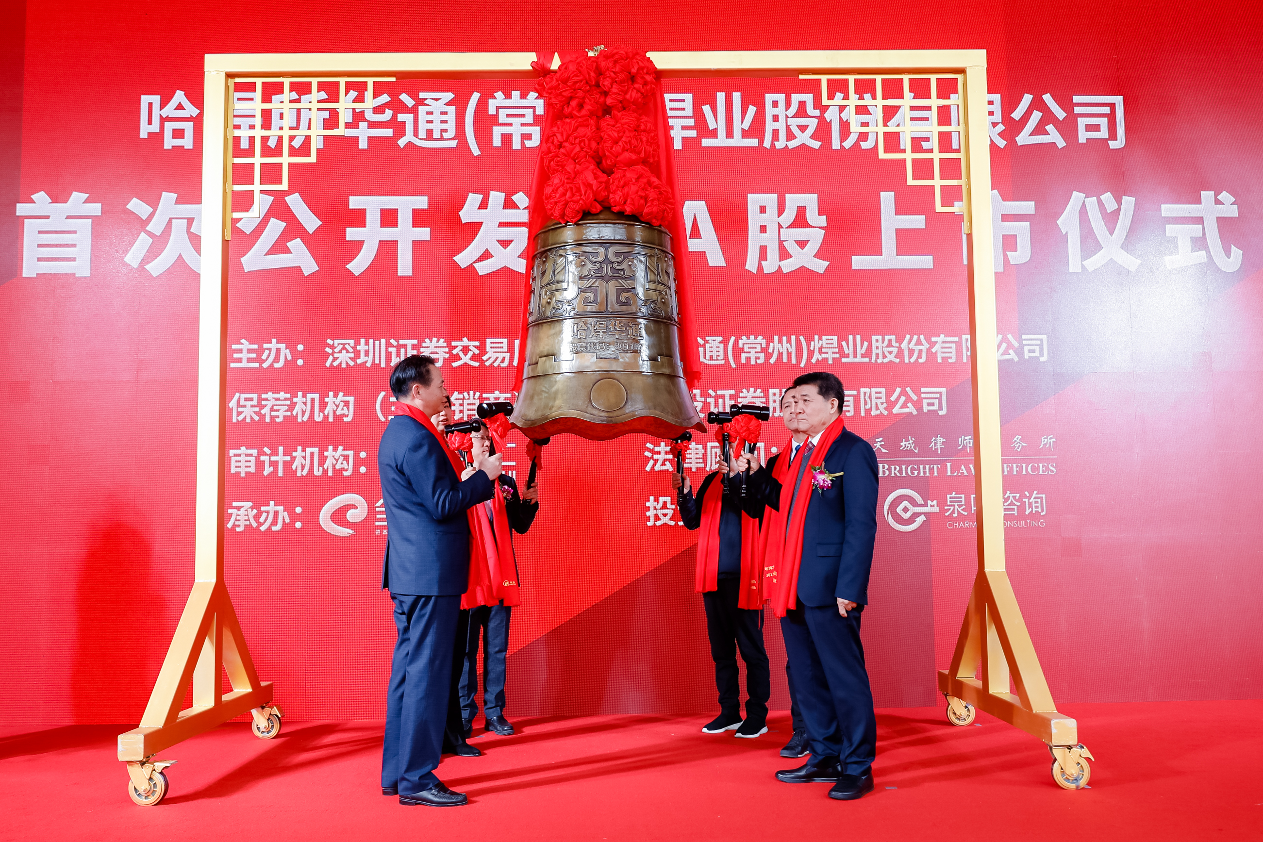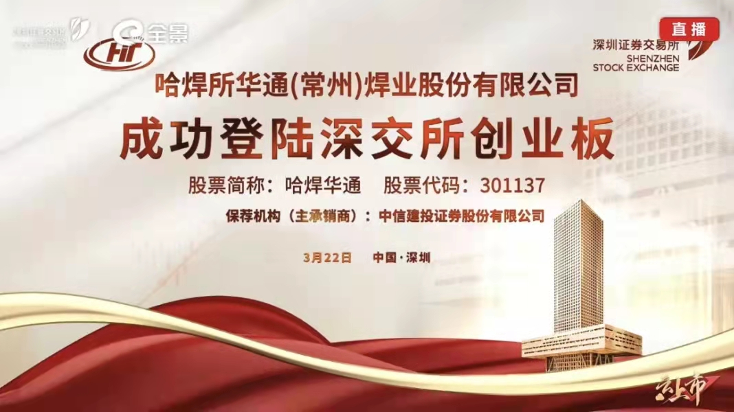 3月22日上午,哈焊所華通(常州)焊業股份有限公司(簡稱:哈焊華通,股票代碼:301137)正式在深圳證券交易所創業板上市,上市儀式以云直播方式在常州舉行,這標志著作為中國機械總院集團首家IPO上市公司,哈焊華通開始踏上資本市場的大舞臺,步入新的發展里程。中國機械總院黨委書記、董事長王德成,深圳證券交易所黨委委員、副總經理李鳴鐘,常州市委書記陳金虎,中信建投投行董事總經理王晨寧,哈焊華通董事長楊玉亭、總經理周全法等出席上市儀式,共同見證這一歷史時刻。