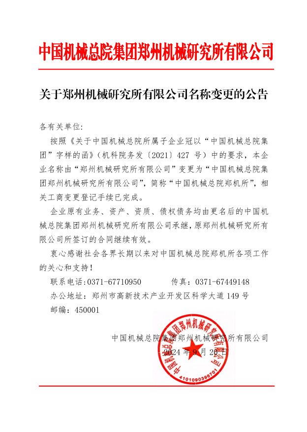 關(guān)于鄭州機(jī)械研究所有限公司名稱變更的公告